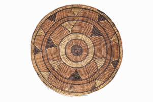 runder Bastdeckel mit zweifarbig geometrischen Mustern, die sich in Kreisen anordnen, sechs Dreiecke erste Peripherie, zehn Dreiecke zweite Peripherie (dunkelblau, dunkelrot)