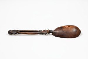 dunkelbrauner Holzlöffel mit flacher langgezogener Kelle, Stiel gespalten, am oberen und unteren Ende mit Rillen verziert, an beiden Enden des gespaltenen Teils sechseckige geometrische Figur angebracht