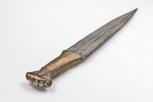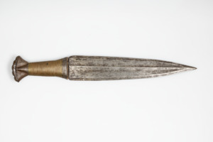 Dolch mit kurzem, drahtumwickeltem Griff, hält flache Klinge, die zur Spitze hin ebenmässig zuläuft, 5 Nieten am Griffende, Griff mit Metall- und Messing-Draht umwickelt