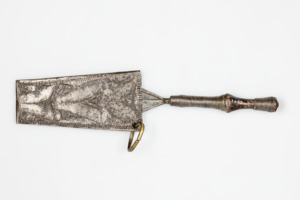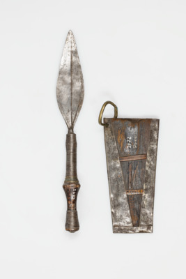 dünner runder Holzgriff teilweise mit Eisendraht umwickelt, Griffende mit Niete versehen; Scheide: trapezförmig, aus gebogenem Eisenblatt, integriertes Palmenblatt, seitlich angebrachter Metallring (Messing), Scheidenrückseite mit eingestanztem Muster; Griff: teilweise mit Draht umwickelt