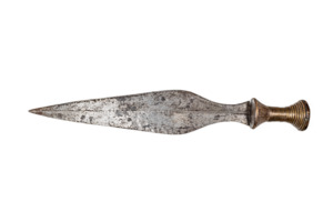 Griff mit dickem Messingdraht umwickelt, Klingenblatt aus Eisen geschmiedet, mittlere Naht beidseitig durch Einritzungen 18 cm lang verziert, zum Ende hin spitz zulaufend