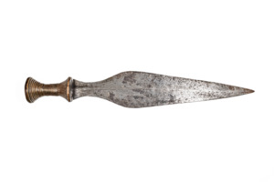 Griff mit dickem Messingdraht umwickelt, Klingenblatt aus Eisen geschmiedet, mittlere Naht beidseitig durch Einritzungen 18 cm lang verziert, zum Ende hin spitz zulaufend
