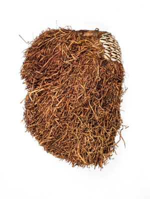 gebundenes Bastbündel, mit fester Pflanzenfaser umwickelt. Kaurischnecken als Zierde aufgesetzt