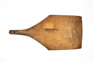 flaches Holzbrett mit geringer Tiefe (2 cm), zum Griff hin spitz zulaufend, durchgehendes Loch im Griff; Doppelkreuz am Griff
