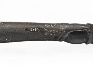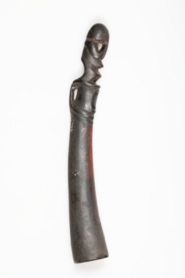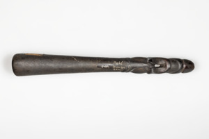 Flöte aus Elfenbein dunkel gefasst, am oberen Ende mit Figur verziert, Mundstück: Ringe eingeschnitzt