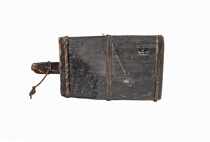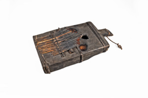 Der rechteckige Resonanzkörper des Musikinstruments ist aus Holz (ausgehöhlt). Ein rundliches Resonanzloch befindet sich auf der Oberseite über dem Steg (aus Holz) mit 16 dünnen Lamellen aus den Rippen der Blätter der Raphiapalme. Die Lamellen werden von zwei dünnen Raphiablattrippen gehalten (umwickelt). Der Resonanzkörper ist an drei Stellen - oben, in der Mitte und unten - mit Pflanzenfasern umwickelt. Das Loch auf der Unterseite ist mit Harz verschlossen. Die gesamte Oberfläche des Resonanzkörpers zeigt Gebrauchspuren, vor allem rechts und links oberhalb des Stegs.