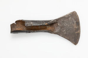 Hacke aus dunklem Holz mit Klinge, glatter Griff, hölzerne Astgabel als Werkzeug ausgebaut, Kniestiel