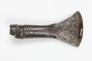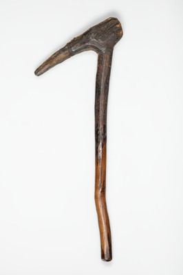 Hacke aus dunklem Holz mit Klinge, glatter Griff, hölzerne Astgabel als Werkzeug ausgebaut, Kniestiel