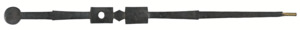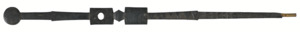 schwertförmiger Stab, mit Rauten- und Zickzackschnitzereien verziert, mittig zwei Rechtecke durch Sechseck verbunden, unteres Ende mit Metall ummantelt (möglicherweise Patronenhülse)