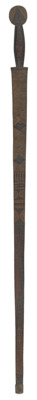 schwertförmiger Stab, mit Rauten- und Zickzackschnitzereien verziert; Enden mit Blech beschlagen