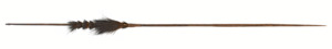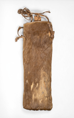 dünne Holzpfeile (32 Stück) mit geschnitzter Spitze, Ende mit Blattstück durchzogen, Köcher aus einem Stück Fell eingeschlagen und mit Lederriemen vernäht, rechts und links der Köcheröffnung breite Pflanzenfasern als Halterung angebracht