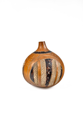 ornamentierte Kalebassenflasche, drei seitlich angeordnete Ovale, innen mit dreifarbigen (weiß, schwarz, natur) Streifen verziert, äußerer Ring, dunkler Reif um den Flaschenhals, übrige Fläche mit kleinen Einkerbungen versehen