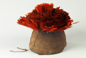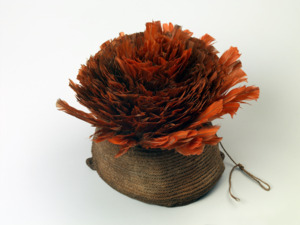 geknüpfte Kappe, am unteren Rand mit zwei Schlaufen, gestutzte Federn des Kongo-Graupapagei (Psittacus erithacus erithacus) oben auf die Mütze geknüpft; konnte zum Schutz der Federn eingeklappt werden. Beschreibung in Inventarliste des Linden-Museum: „1 Kriegsmütze aus Bast e Federn, W.Af., Kamerun, Jaunde“; Graf Linden bestätigt am 11.12.1906 „von Ihnen [K. Haberer] ein sehr hübsches Lebenszeichen in der Gestalt einer federgeschmückten Kriegsmütze aus Bast von Jaunde zu erhalten“ (Linden-Museum, Archiv).