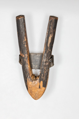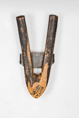geschnitze Holzgabel mit flacher Metallklinge durchzogen, dunkelbraun gefasst