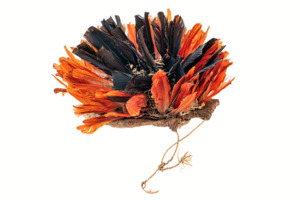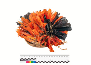 Mütze aus Rindenbast mit geknüpftem Netz überzogen, in das rote und schwarze Federn gesteckt sind, Kordel zum Zuziehen, konnte zum Schutz der Federn umgestülpt werden, rote Federn: Schwanzfedern des Kongo-Graupapagei (Psittacus erithacus erithacus)
