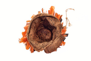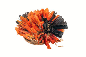 Mütze aus Rindenbast mit geknüpftem Netz überzogen, in das rote und schwarze Federn gesteckt sind, Kordel zum Zuziehen, konnte zum Schutz der Federn umgestülpt werden, rote Federn: Schwanzfedern des Kongo-Graupapagei (Psittacus erithacus erithacus)