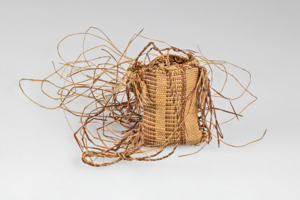 kleines viereckiges Täschchen aus feinem Bast (hell-dunkelbraunes Streifenmuster), mit langem Bastband (zum Umhängen?), lange Bastfäden an vier Ecken; Inhalt unbekannt