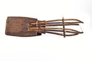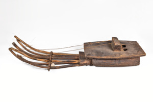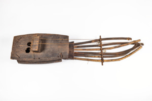Holzkorpus mit zwei Schallöchern und einem Steg. Enthält zwei Saiten und sechs dünne Holzstäbe