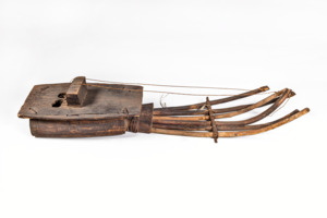 Holzkorpus mit zwei Schallöchern und einem Steg. Enthält zwei Saiten und sechs dünne Holzstäbe