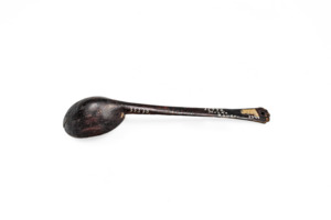 dunkelbraun lackierter Holzlöffel, Stiel und Laffe (Schale) aus einem Stück Holz gearbeitet, Stiel: auf der Vorderseite diagonale Streifen, durch Einkerbungen entstanden