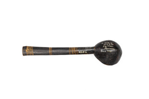 Dunkelbraun lackierter Holzlöffel mit verziertem Stiel, möglicherweise Laffe (Schale) und Stiel aus zwei Teilen, Stiel: auf Vorder- und Rückseite waagrechte Einkerbungen (Linien und Punkte), nicht identisch.