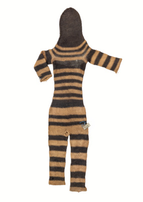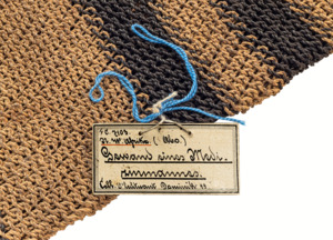 Natur und dunkel gefärbt in Blockstreifen; handschriftlich mit Bleistift in Inv.-Buch: "eines Medizinmannes" u. "inneres Kamerun"