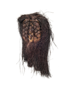 vier Teile: lange, sehr feine schwarz gefärbte Pflanzenfasern, in der Mitte zu Zöpfen geflochten, die offen in Fasern auslaufen. Die einzelnen Teile wurden nebeneinander um eine schmale Schnur geschlagen.