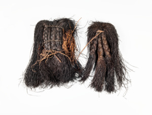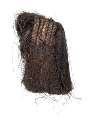 vier Teile: lange, sehr feine schwarz gefärbte Pflanzenfasern, in der Mitte zu Zöpfen geflochten, die offen in Fasern auslaufen. Die einzelnen Teile wurden nebeneinander um eine schmale Schnur geschlagen.