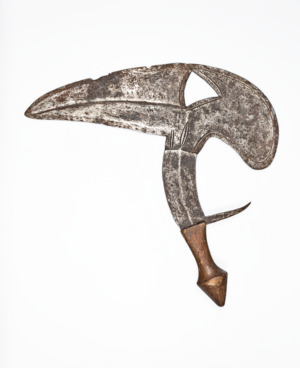 sieht aus wie ein Vogelkopf, kegelförmiger kurzer Griff, kleine Spitze am Anfang der Klinge, große Spitze am Ende, Spitze verziert, dreieckiges Loch, Einkerbungen