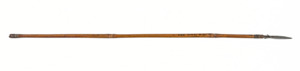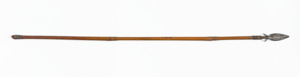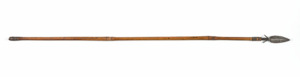 v-förmige Kerbe am Schaftende mit Fadenumwicklung, blattförmige Spitze mit zwei Widerhaken in den Schaft gesteckt