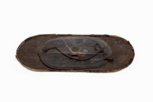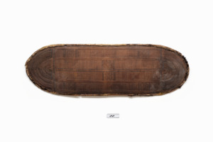 ovaler Flechtschild mit ovaler Holzplatte und geflochtenem Band auf der Innenseite, nicht mehr vollständig erhaltene Fellumrandung