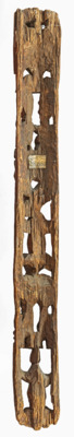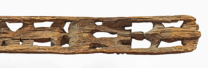 geschnitzter Hauspfosten mit Menschen- und Tierdarstellungen im Relief