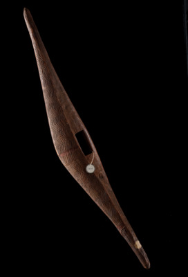Länglicher Parierschild aus dunklem Holz, keilförmig mit spitz zulaufenden Enden, Griff aus dem massiven Holz geschnitzt, wellenförmiges Muster auf der Vorderseite eingeritzt, rot eingefärbte Rille in der Mitte der Vorderseite gegenüber von Griff. / Der Parierschild wurde von einem unbekannten Schnitzer vermutlich in Victoria oder in Südostaustralien allgemein, im 19. Jh. angefertigt und um 1900 nach Europa verbracht.