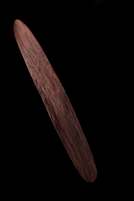 länglicher Schild mit Griff, beide Seiten mit wellenförmigen Einritzungen, Seite ohne Griff mit roten Streifen