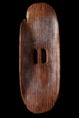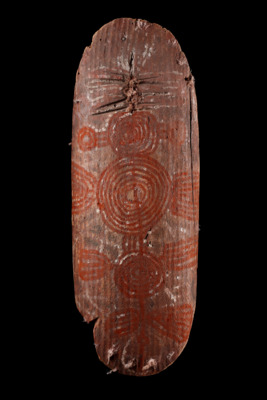 Schild mit Haltegriff, reichliche Verzierungen und in gewölbter Form, rot-orange Malereien, angeklebte Baumwolle, weiße Schattierungen, Schnitzereien am oberen Ende
