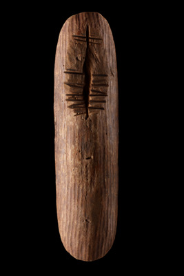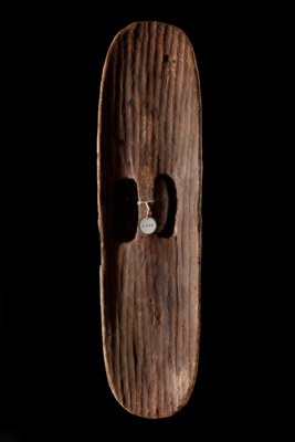 Schild mit Griff an der Rückseite, Oberseite grobe Einkerbungen, Schnitzereien in Form eines Gesichts am oberen Ende