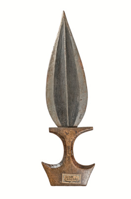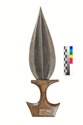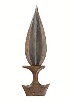 Nach oben spitz zulaufende blattförmige Klinge auf ankerförmigem Holzgriff, blattförmige Schabspuren in der Mitte der Klinge