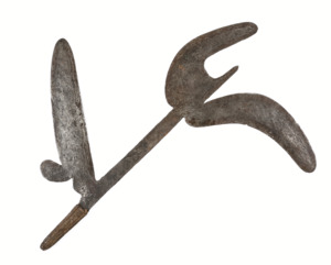 Schmaler, spitz zulaufender, flacher Stab, dessen unterer Teil (9 cm) mit Flechtwerk umwickelt ist. Unmittelbar über dem Flechtwerk geht eine länglich-ovale, vorne abgerundete Klinge ab, ebenso beidseitig an der Stabspitze.