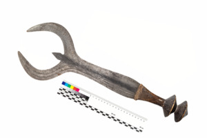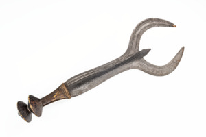 Die Klinge ist mittig mit sechs wellen- und strichförmigen Einkerbungen verziert. Sie teilt sich nach ca. 12 cm beidseitig sichelförmig. Zwischen den Sicheln verläuft eine ca. 4 cm lange pfeilähnliche Spitze. Der Griff endet in einem Doppelkreisel.