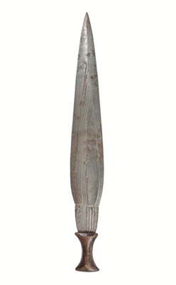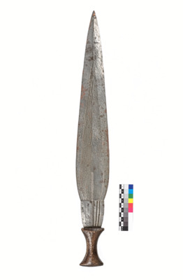 Auf dem knochenförmigen Holzgriff sitzt eine unten bauchige, nach oben spitz zulaufende Klinge. Auf der linken Klingenseite beginnen 6 cm über dem Griff 10 linienförmige Einkerbungen. Die ersten 6 cm der Klinge sind rechts mit 3 Kerben verziert.
