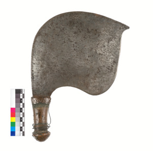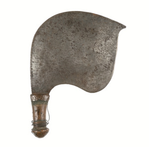 Klinge auf äußerer Seite sichel- auf innerer Seite rochenförmig, Griff: unten Halbkugel, auf der sich nach oben hin verbreitender Griff sitzt, punktförmige Einklopfungen, Griff mit Draht umwickelt