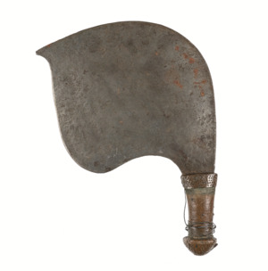 Klinge auf äußerer Seite sichel- auf innerer Seite rochenförmig, Griff: unten Halbkugel, auf der sich nach oben hin verbreitender Griff sitzt, punktförmige Einklopfungen, Griff mit Draht umwickelt