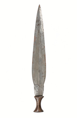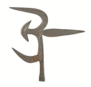 Direkt über dem Griff nach oben gerichtete sichelförmige Klinge (12 cm), nach 11 cm geht nach rechts eine ankerförmige Klinge ab (8 cm), nach links eine gerade (20 cm), Klinge läuft oben aus in einer nach rechts gebogenen, sichelförmigen Klinge, pfeil- , linien- und sonnenförmige Gravur auf Klinge, Griff mit Kupferdraht umwickelt.