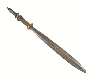 Scheide: L 53,7 cm / B oben 5,7 cm / B unten 11,3 cm; Schwert: L 68,5 cm / L Griff 20,5 cm / B Klinge 4,7 cm