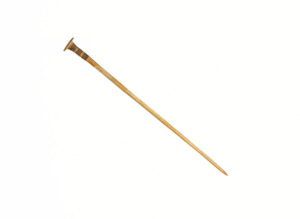 Haarspfeil in Nagelform, vom Kopf bis zur Spitze gleichmäßig konisch zulaufend, am Griffende drei Streifen von 0,5 cm Breite im Abstand von 0,2 cm, Muster der Streifen sind eingeritzte Rautenketten, flacher, breiter Nagelkopf mit D 1,7 cm