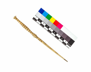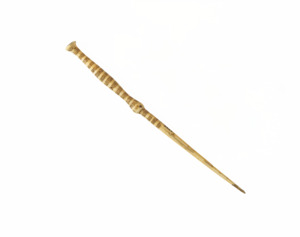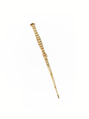 Haarpfeil in "Nagelform", Griff des Haarpfeils ist kunstvoll bearbeitet, Elfenbeinstab an mehreren Stellen verschlankt und mit abgeflachtem ovalem Kopf von ca. 0,7 x 1 cm Durchmesser, verziert mit achtzehn Streifen, von oben bis in die Mitte