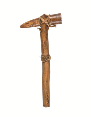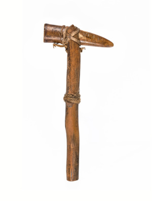 Der hölzerne Griff ist am oberen Teil gespalten. In den Spalt wurde der Hornkopf gesteckt und mit einer Schnur aus Pflanzenfasern befestigt.