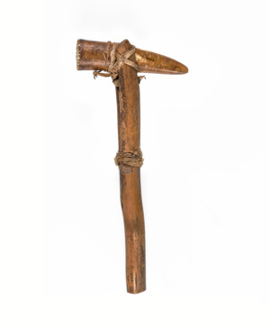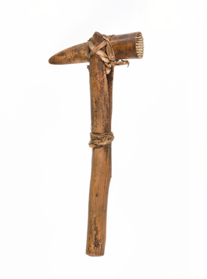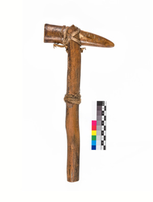 Der hölzerne Griff ist am oberen Teil gespalten. In den Spalt wurde der Hornkopf gesteckt und mit einer Schnur aus Pflanzenfasern befestigt.