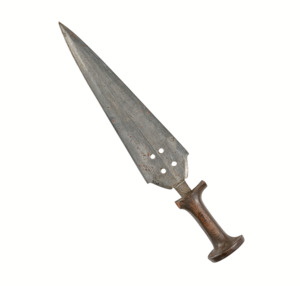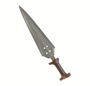 Metall der Dolchklinge als Stiel durch den gesamten Holzgriff geführt, zwischen Griff und Klinge 1,6 cm des Stiels mit 4 Löchern verziert, Knauf am Ende des Griffs