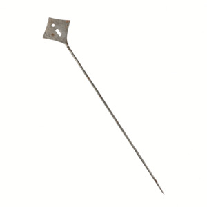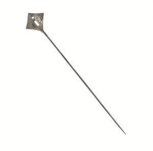 Der Übergang vom flachen Kopfstück zur runden Pfeilform ist durch eine dreifache Schaubung des Eisensstabs gekennzeichnet. Bei den Löchern im Kopfstück handelt es sich um ein viereckiges Loch mit 1 x 0,5 cm und ein Rundloch von D. ca 0,4 cm. Kopfstück in Karoform